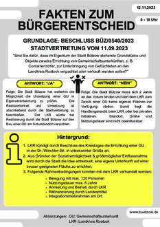 Der Landkreis Rostock ist gesetzlich zur Unterbringung von Asylbewerbern und Kriegsflüchtlingen verpflichtet und aufgrund der seit 2022 wieder stark gestiegenen Zugangszahlen dringend gehalten, weitere Gemeinschaftsunterkünfte zu schaffen. Dies gestaltet sich schwierig, weil es nicht ausreichend geeignete Angebote gibt. In der Stadt Bützow ist deshalb die Bebauung einer kreiseigenen Fläche angedacht. Von diesen Planungen würde der Landkreis Abstand nehmen, wenn sich eine alternative Fläche bzw. ein alternatives Objekt, wie es bereits gemeinsam erörtert wurde, finden würde. Im Umkehrschluss bedeutet das aber auch, dass der Landkreis seine eigenen Planungen mit Hochdruck weiter verfolgen muss, sollte die Stadt Bützow im Ergebnis des Bürgerentscheids nicht als Partner zur Verfügung stehen.