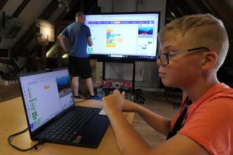 Bildunterschrift: Eröffnung der TechnoThek im August: Joel programmiert ein Videospiel. Merlin testet es am großen Multiscreen.