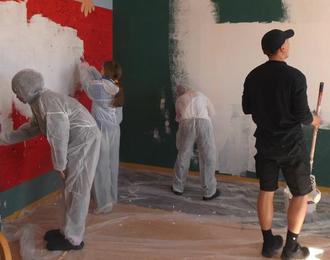 Wir haben den Aktions-Raum neu gestrichen, mit selbst gestalteten Gardinen bestückt und zusammen ein großartiges Wandbild geschaffen.