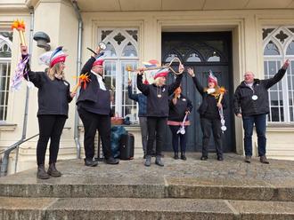 Während die angeschlagenen Mitstreiter sich daheim auskurieren mussten, zog der Rest mit dem bunt geschmückten Wagen los. Wie jedes Jahr besuchten wir die Kita Lebenshilfe, schauten bei einigen Sponsoren vorbei und machten lautstark auf den 11.11., die Schlüsselübergabe um 11:11 Uhr und unser diesjähriges Motto aufmerksam: