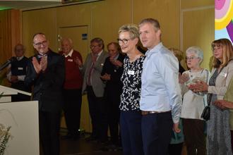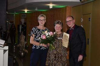 Stadtpräsidentin Heike Rahn und Bürgermeister Christian Grüschow gratulieren Monika Thomsen (Mitte)