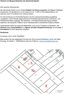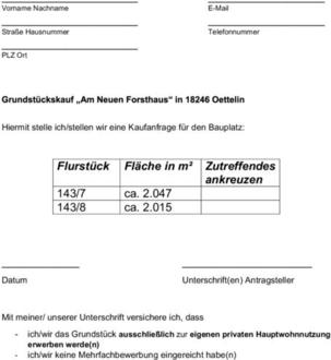 Interessenten haben ab sofort die Möglichkeit, sich um ein Flurstück zu bewerben. Der Verkauf erfolgt ausschließlich zur eigenen privaten Hauptwohnnutzung. Es wird max. 1 Grundstück an einen Bewerber vergeben.