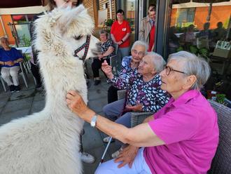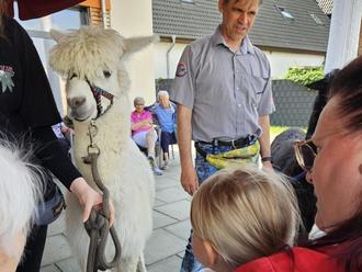 „Dass wir noch im Alter so viel lernen, hätte ich auch nicht gedacht“, zeigt sich Tagesgast Christa Kilindo überrascht, von dem tierischen Besuch in der DRK-Tagespflege in Bützow. Marco Holter vom Alpakahof am Iserberg in Grevesmühlen brachte zwei Alpakas mit nach Bützow und hatte viel Wissenswertes über die ausgebildeten Therapietiere zu berichten, die regelmäßig Hospize, Kindereinrichtungen, Angstpatienten oder - wie hier - Senioreneinrichtungen besuchen. Die Tagesgäste zeigten sich begeistert von dieser domestizierten Kamelart mit dem weichen Fell. „Alpakas sind sehr freundliche, gutmütige, intelligente, neugierige und liebevolle Wesen. Sie ließen sich die ganze Zeit ohne weiteres von den Tagesgästen streicheln“, beobachtete Pflegedienstleiterin Nicole Beese. Die Senior:innen der Einrichtung genossen den Besuch. „Und das Strahlen in ihren Augen ist unbezahlbar für uns als Mitarbeitende“, so Nicole Beese weiter.
