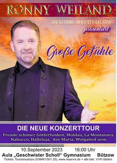 Ronny Weiland, der Sänger mit der tiefen Gänsehautstimme, geht mit seinem neuen Programm „Konzert der Gefühle“ auf Deutschlandtour. Die Idee zur neuen Show kam von den Zuschauern. In vielen Gesprächen und Briefen dankte das Publikum Ronny Weiland, dass seine Lieder gut für die Seele seien und sie voller Gefühle und Emotionen ein jedes Konzert erleben durften.