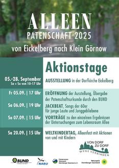 Um eine Patenschaftsurkunde für diesen Abschnitt zu bekommen, wurde die Allee in diesem Jahr ausgiebig erforscht, erwandert und katalogisiert. Daraus entstanden ist ein Plan für die zukünftigen Aufgaben der „Paten“. Alle Ergebnisse, neben wunderschönen Fotos von der Allee in allen Jahreszeiten, werden ab dem 5. September in der Dorfkirche in Eickelberg jeweils an den Wochenenden zu sehen sein.