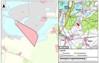 Begrenzt wird das Plangebiet im Norden durch die Gemeindegrenze Pinnow und den Geltungsbereich des vorhabenbezogenen Bebauungsplans Nr. 21 „Photovoltaikanlage Kieswerk Pinnow Süd“ der Gemeinde Pinnow, im Osten durch den Kiessee und das Kieswerk sowie durch die Wohnbebauung im Ortsteil Zietlitz und im Süden und Westen durch den Kiessee und das Kieswerk.