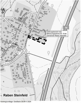 Der Geltungsbereich des Bebauungsplanes mit einer Größe von ca. 2.079 m² befindet sich im Oberdorf von Raben Steinfeld, östlich der Leezener Straße und schließt etwa 100 m nördlich des Kreisverkehrs an die bebaute Ortslage an. Der Geltungsbereich umfasst Teilflächen der Flurstücke 90/25, 90/30, 155/3, 156 sowie das Flurstück 155/4 der Flur 1 in der Gemarkung Raben Steinfeld (sh. Übersichtskarte).