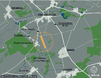 Das Gebiet des vorhabenbezogenen Bebauungsplanes befindet sich östlich des Ortsteils „Friedrichsruhe Dorf", westlich und parallel zur Bahnstrecke Schwerin-Parchim.