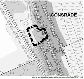 Der Geltungsbereich des Bebauungsplans Nr. 24 befindet sich im Süden der Ortslage Consrade, westlich der Consrader Straße und nördlich der Straße Am Hang. Er umfasst das Flurstück 124/3 sowie Teilflächen der Flurstücke 123/31 und 180/4 der Flur 1 in der Gemarkung Consrade mit einer Gesamtfläche von ca. 1,6 ha (sh. Übersichtsplan).