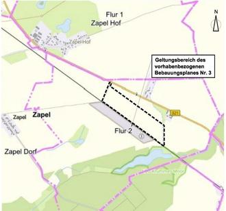 Der Geltungsbereich des Bebauungsplans umfasst eine ca. 195 m breite Fläche außerhalb des Bahnflurstücks (siehe Übersichtsplan). Mit einer Gesamtgröße von insgesamt 16,98 ha werden die Flurstücke 15/16 (Teilfläche) und 29/2 in der Flur 2 der Gemarkung Zapel-Dorf in Anspruch genommen.