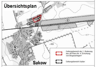 Die Gemeindevertretung der Gemeinde Sukow hat am 30.04.2025 die Satzung über die 1. Änderung des vorhabenbezogenen Bebauungsplans Nr. 4 „Errichtung von Biogasanlagen" bestehend aus der Planzeichnung (Teil A) und dem Text (Teil B) beschlossen. Der Vorhaben- und Erschließungsplan ist Bestandteil der Planung.