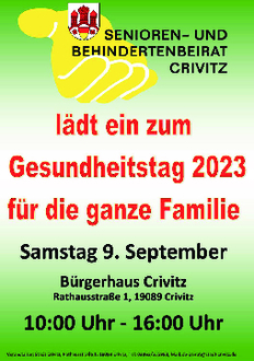 Der 09.09.2023 steht in Crivitz ganz im Zeichen der Gesundheit. Der Senioren- und Behindertenbeirat hat unter der Schirmherrschaft der Bürgermeisterin von 10 Uhr bis 16 Uhr am und im Bürgerhaus ein umfangreiches Angebot zum Mitmachen und Ausprobieren für die ganze Familie organisiert. Es gibt jede Menge Informationen und Beratung rund um das Thema Gesundheit und Sicherheit.