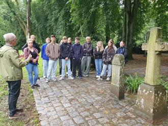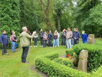 Der geplante Wandertag am 23. Juli 2025 der Pestalozzi-Schüler aus der Klasse 9b wäre bei dem Dauerregen dieser Tage fast „ins Wasser gefallen“. Aber der Himmel meinte es gut mit der Gruppe. Es nieselte zunächst nur ein wenig, und so konnten Ernst Wellmer und Günter Behnke als Vertreter des Volksbund-Regionalverbandes die Jugendlichen sowie ihre Lehrerinnen Katharina Hüfner und Andrea Garling auf dem Demminer Bartholomaei-Friedhof herzlich begrüßen. Ernst Wellmer freute sich über das Interesse an der Arbeit des 1919 gegründeten Verbandes und seinen vielfältigen Aufgaben, zu denen auch die Bildung und Begegnung junger Menschen an den Ruhestätten der Opfer von Kriegen und Gewaltherrschaften gehört. „Gegenwärtig betreut der Volksbund 832 Kriegsgräberstätten in 46 Staaten mit 2,8 Mio. Toten“, so der Altbürgermeister. „Im Land Mecklenburg-Vorpommern gibt es 601 offiziell anerkannte Kriegsgräberstätten mit 76.843 Kriegsopfern, davon in unserer Hansestadt Demmin immerhin 8 mit 2.081 Kriegstoten“. Bis heute würden die entsprechenden Bestattungsunterlagen und andere Dokumente weiter aufgearbeitet, so dass sich diese Zahlen zukünftig noch verändern könnten. „Kriege bringen nur Leid, Trauer und Unglück. Mit unserer Arbeit wollen wir der Toten gedenken, ihnen eine würdige Ruhestätte geben oder erhalten, aber besonders immer wieder zum Frieden mahnen“, so Wellmer. Während eines etwa einstündigen Rundgangs über das Friedhofsgelände informierte sodann Günter Behnke über die 5 offiziellen Kriegsgräberstätten und das Kindergräberfeld in der Jarmener Straße. Außerdem gab es Informationen zu weiteren Demminer Gedenkorten auf dem Barlach-Platz, auf dem Vorwerker Friedhof und in der Woldeforst sowie zu den schlimmen Ereignissen zum Kriegsende 1945 in der Stadt. Die Gruppe bedankte sich abschließend mit einer Spende in Höhe von 30,00