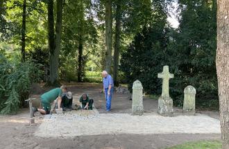 Die 46-er Kriegsgräberanlage für Heimatlose, eine der größten auf dem Demminer Friedhof in der Jarmener Straße, wird derzeit saniert. Nach heutigem Wissensstand sind hier Kriegstote, die u.a. durch Hunger, Krankheit oder Erschöpfung nach den Strapazen der Vertreibung ums Leben kamen, in 525 Einzelgräbern und 110 Tote in einem Sammelgrab bestattet worden. „Derzeit werden die Unterlagen der Friedhofsverwaltung nochmals geprüft, um möglichst die genaue Zahl der Opfer des II. Weltkrieges, insbesondere Flüchtlinge, die hier ihre letzte Ruhestätte fanden, zu ermitteln“, so Volksbund-Stadtverbandsvorsitzender Ernst Wellmer. Der Verband unterstützte die Friedhofsverwaltung und die Hansestadt Demmin bei der Planung und Antragsstellung für die Fördermittel. „Nun sind wir sehr dankbar, dass die erforderlichen ca. 25.000 Euro für die Maßnahme vom Landesamt für Innere Verwaltung bewilligt wurden“. Im Frühjahr konnten bereits einige morsche Bäume und Sträucher auf der Anlage entfernt bzw. zurückgeschnitten werden. Im Juli wurden dann die Gedenksteine gerichtet. Sie sollen auch noch gereinigt werden. Um sie herum wurde außerdem ein Vorplatz sowie eine Zuwegung mit Granitpflaster befestigt. Ein einzelner, noch verbliebener Grabstein wurde umgesetzt. Im Herbst erfolgen abschließend noch Ersatzpflanzungen für die gefällten Bäume und die gärtnerische Gestaltung des Umfeldes der Gedenkstätte, so dass die Sanierung noch in diesem Jahr planmäßig beendet werden kann.