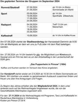 | Kaffeetreff | 10.09.2024 | ab 14 Uhr im Kaffee Kruse |