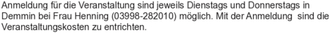 Anmeldung für die Veranstaltung sind jeweils Dienstags und Donnerstags in Demmin bei Frau Henning (03998-282010) möglich. Mit der Anmeldung sind die Veranstaltungskosten zu entrichten.