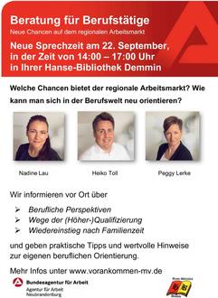 Nutzen Sie die Gelegenheit, Ihre berufliche Zukunft aktiv zu gestalten. Lassen Sie sich inspirieren, beraten und begleiten – am 22. September in Demmin oder online.