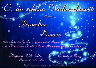 Es ist wieder soweit - die festliche Jahreszeit beginnt, und wir, die Sängerinnen und Sänger des Peenechores Demmin, möchten Sie auf die schönste Zeit des Jahres einstimmen. In zwei Konzerten erleben Sie bekannte, aber auch unbekannte Weihnachtsliteratur und sind beim gemeinsamen Singen herzlich eingeladen, die Advents- und Weihnachtszeit mit uns musikalisch einzuläuten. Zum ersten Mal wird sich in den beiden Weihnachtskonzerten auch das neu gegründete Kammerensemble des Peenechores präsentieren. Erleben Sie den Zauber der Weihnacht und tauchen Sie ein, in eine Stunde der Besinnlichkeit, der Ruhe und des Friedens.