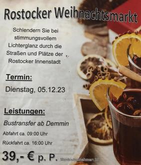 Reisen: Für die Fahrt am 05.Dezember 2023 zum Rostocker Weihnachtsmarkt sind noch einige Plätze verfügbar. Die konkreten Demminer Abfahrtzeiten werden