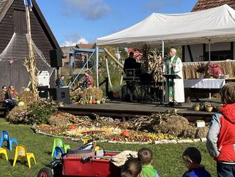 Am Sonntagvormittag fand bei strahlendem Sonnenschein der Erntedankgottesdienst statt. Auf der vom Waldkindergarten mit einem wunderschönen Herbstmandala geschmückten Bühne zelebrierte Pastor Wiesenberg einen feierlichen Herbstgottesdienst.