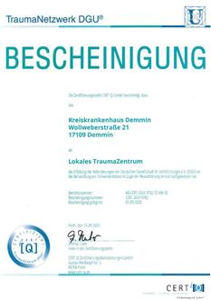 Das Kreiskrankenhaus Demmin bleibt ein verlässlicher Partner für die Versorgung von Schwer- und Mehrfachverletzten in der Region. Die Deutsche Gesellschaft für Unfallchirurgie (DGU) hat das Lokale TraumaZentrum am Kreiskrankenhaus Demmin erneut zertifiziert. Damit ist die hohe Behandlungsqualität bis September 2028 bestätigt – rund um die Uhr, an 365 Tagen im Jahr.