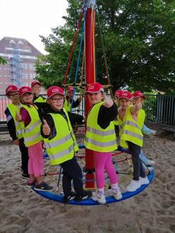 Alle Kinder waren mit einem knallroten Basecap und einer Warnweste gesponsort von der KFZ-Prüfstelle Thiel und Kanyar in der Rosestraße ausgestattet.