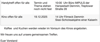 | Handytreff offen für alle | Termin und Thema stehen noch nicht fest | 10:00 Uhr Büro IMPULS der Hansestadt Demmin, Treptower Straße 28 |