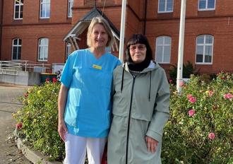 Ursula Mauritz (re.) mit Kinderstationsschwester Martina Berndt vor dem Kreiskrankenhaus Demmin.