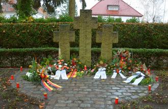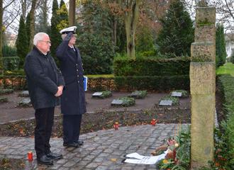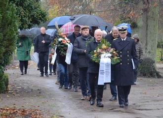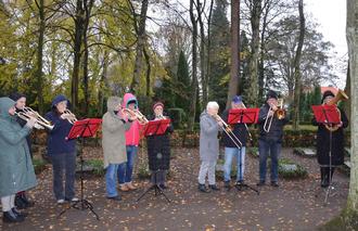 Unter Glockengeläut begaben sich die Anwesenden sodann gemeinsam zur „Kriegsgräberstätte Zweiter Weltkrieg/Soldatengräberfeld“. Bürgermeister a. D. Dr. Michael Koch, Regionalverbandsvorsitzender des Volksbundes, sprach nach der Kranzniederlegung das offizielle Totengedenken, bevor der Posaunenchor, der die gesamte Veranstaltung musikalisch umrahmt hatte, mit dem „Pommernlied“ die würdige Gedenkstunde beendete. Im Totengedenken heißt es u.a.: „Wir trauern mit allen, die Leid tragen um die Toten und teilen ihren Schmerz. Aber unser Leben steht im Zeichen der Hoffnung auf Versöhnung unter den Menschen und Völkern, und unsere Verantwortung gilt dem Frieden unter den Menschen zu Hause und in der ganzen Welt.“