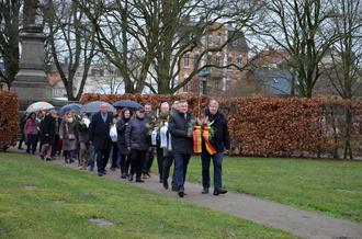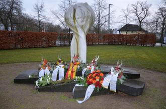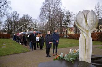 Im Anschluss an die Veranstaltung im Gemeindesaal legten die Vertreter der Stadt, des Landkreises, des Volksbundes Deutsche Kriegsgräberfürsorge und der politischen Parteien Blumengebinde am Gedenkstein für die Opfer von Krieg und Gewalt auf dem Ernst-Barlach-Platz nieder und verharrten in einer Schweigeminute.