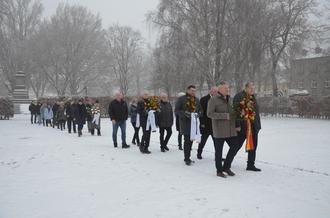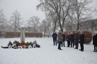 Im Anschluss an die Veranstaltung im Gemeindesaal legten die Vertreter der Stadt, des Landkreises, des Volksbundes Deutsche Kriegsgräberfürsorge und der politischen Parteien Blumengebinde am Gedenkstein für die Opfer von Krieg und Gewalt auf dem Ernst-Barlach-Platz nieder.