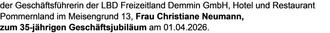 Frau Christiane Neumann, zum 35-jährigen Geschäftsjubiläum am 01.04.2026