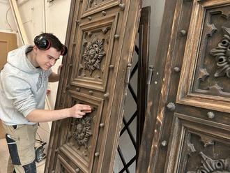 Paul beim Schmirgeln der Malchiner Rathaustüren