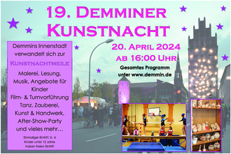 Anlässlich der 19. Kunstnacht wird die Demminer Innenstadt vom Marktplatz bis zum Marienhain zur „Kunstnachtmeile“. Viele Geschäfte haben geöffnet. Für das leibliche Wohl wird gesorgt. Einmaliger Eintritt für alle Veranstaltungen: 3,00 €, Kinder unter 12 Jahre haben freien Eintritt! Änderungen vorbehalten!