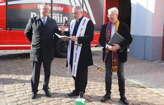Damit Gottes Segen sowohl dem Fahrzeug als auch der Mannschaft bei den Einsätzen stets begleiten möge, wurde das Fahrzeug vom katholischen Pfarrer Johannes Schaan und die Mannschaft vom evangelischen Pastor Martin Wiesenberg feierlich gesegnet.
