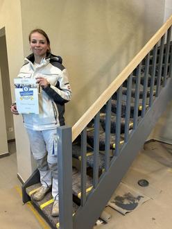 Zukunftsgewinnerin Sabrina mit der Urkunde auf der frisch gestrichenen Treppe