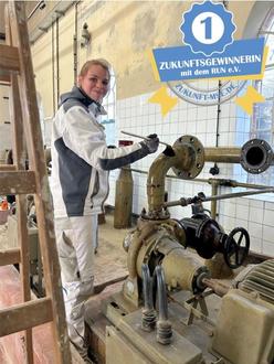 Wir sind gerade mit unserem Team am Alten Wasserwerk von Malchin, wo wir schon länger alle Maler- und Lackiertätigkeiten ausführen. Gerade streicht mein Kollege die Treppe und ich lackiere mit einer Schülerpraktikantin die alten Rohre des Wasserwerkes zum Schutz, aber auch zur optischen Verschönerung. Im Mai findet ja die Eröffnung zum Wasserwerk der Zukunft statt und bis dahin müssen wir hier fertig sein. Du arbeitest ja hier ganz selbstständig ohne Anleitung. In welchem Ausbildungsjahr bist du denn? Ich bin jetzt im 2. von insgesamt 3 Lehrjahren zur Malerin und Lackierin.