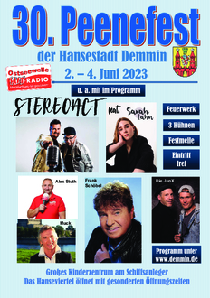 Das 30. Peenefest findet traditionell ein Wochenende nach Pfingsten statt. Vom 02. bis 04.06.2023 verwandelt sich Demmins Hafen wieder zur Party- und Bummelmeile. Wie gewohnt wird es ein buntes Kulturprogramm geben. Auf drei Bühnen werden sich Demminer Vereine und bekannte Künstler aus der Musikwelt präsentieren. Gleichzeitig werden viele Sportveranstaltungen stattfinden, wie z.B. Tennis, Modellsport, Boxen, Fußball, Badminton, Radball, Tischtennis, Hundesport und Kegeln. Am 02.06.2023 startet um 19:00 Uhr der bei den Kindern beliebte Fackel- und Lampionumzug am Marienhain. Musikalisch begleitet wird der Umzug von den Kartlower Schalmeien bis zum Hafengelände, wo bereits Clown Clownikuss mit einem Kinder- und Familienprogramm wartet. Ab 21:00 Uhr steigt im Festzelt die große Party mit DJ Torsten von der Schirmbar aus Oberwiesenthal sowie Erfolgs DJ- & Produzentenduo Stereoact feat. Sarah Lahn. Auch das große Eröffnungs-feuerwerk wird wieder am Freitagabend den Himmel zum Leuchten bringen. Am Samstag und Sonntag können sich die Besucher unter anderem auf die Dancing Angels, die Stilbruch Dancing Girls, Jo & Josephine, Diana & Marco sowie Muck mit seinem 50. Bühnenjubiläum, Die JunX und dem bekannten Sänger Frank Schöbel freuen. Nicht fehlen dürfen die Deventer Hanzesingers sowie die Künstler und Vereine aus Demmin und Umgebung, die in das Programm eingebunden werden. Offiziell eröffnet wird das Peenefest am Samstagvormittag um 11:00 Uhr im Festzelt durch den Bürgermeister Thomas Witkowski, wo er auch die Gäste aus den Partnerstädten begrüßen wird. Am Schiffsanleger lädt das Kinderzentrum wieder zu Spiel, Spaß und Animation ein. Auch das Demminer Hanseviertel auf der Fischerinsel wird mit Sonderöffnungszeiten und kostenfreiem Eintritt geöffnet sein. Dort werden Rabengesang, ein Comedy-Zauberer, das Musiktheater aus Cammin sowie Jörg Hinz aus Binz für die Besucher auftreten. Für die Kleinsten gibt es verschiedene Bastelangebote und Ponyreiten. Heimdalls Brüder präsentieren Lagerleben und Wikingerkämpfe. Die Blau-Weisse-Flotte bietet anlässlich des Peenefestes am 04.06.2023 Schifffahrten auf der Peene zum Sonderpreis an. Jeweils um 11:00, 12:00 und 15:30 Uhr wird die Plauer-Werder für eine Stunde auf dem Amazonas des Nordens fahren. Um 13:30 Uhr wird eine zweistündige Fahrt angeboten.
