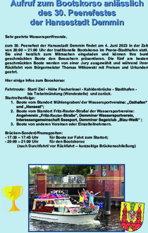 Weitere Höhepunkte werden der Kutterruderwettkampf sowie der Bootskorso am Sonntagabend auf der Peene sein. Die Teilnehmer des Kutterruderwettkampfes rudern um die Wette und damit um die Preise, die Bürgermeister Thomas Witkowski übergeben wird. Die Organisatoren hoffen auf eine rege Teilnahme beim Bootskorso am Sonntagabend um 20:00 Uhr. Die fünf schönsten geschmückten Boote werden von einer Jury prämiert. Dank gilt wie immer den Sponsoren und Unterstützern, dem Ostseewelle Hitradio M-V, der e.dis AG, der Event Company Nord, dem Großmarkt Rostock, der Blau-Weissen-Flotte und der Peene Marina Demmin.