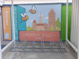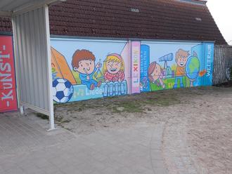 Endlich ist der Schulhof der Grundschule „Heinrich Zille“ bunter! Eine 20 Meter lange Wand auf unserem Hof des Hauptgebäudes wurde durch Enrico Pense (Saneks) aus Greifswald kindgerecht und farbenfroh gestaltet. Die Kinder konnten miterleben, wie jeden Tag auf der hellgelben Wand ein tolles Bild entstand.
