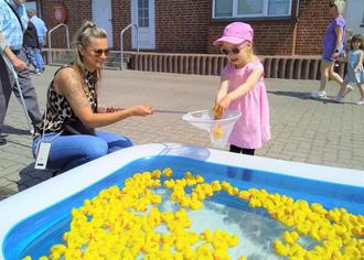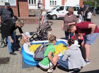 Viele kleine und große Peenefestbesucher freuten sich beim Entenfangen am Stand der Evangelischen Gemeinschaft. Denn für jede gekescherte Ente erhielten sie einen Gewinn. Und die Gewinne durften sie sich aus den Sortimenten in der Hütte selbst aussuchen. Da gab es jede Menge Bücher, Spielzeuge, Süßigkeiten, Getränke, Keramik, Textilien … Schließlich befanden sich unter den nummerierten Enten auch einige Hauptpreise wie Massagegutscheine, schnurlose Computermäuse oder elektronische Lernspiele.