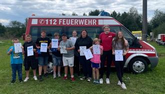 Diese Abnahme, der stets begehrten Abzeichen, wurde am nächsten Tag fortgesetzt. Auch hier mussten die Kinder und Jugendlichen wieder ihr Wissen und ihre Fertigkeiten im Bereich der feuerwehrtechnischen Grundfertigkeiten unter Beweis stellen. Dazu gehörten zum Beispiel Löschangriff, Erste-Hilfe und Knotenkunde. Am Abend durften alle ausgelassen bei einer Disco feiern. Bei wildem Tanzen und Umherhüpfen bis in den Freitagmorgen wollte noch niemand an Abschied und Ende denken. Doch der Freitag kam. Obwohl bis zur Abreise am Mittag noch etwas Zeit war, war das Gesamtbild geprägt von hektischem Sachenpacken und Aufräumen. Platzmangel in den Taschen sollte wohl niemand haben, denn die “Süßigkeiten-Koffer” waren natürlich leer. Bevor der Heimweg angetreten wurde, wurden in einer feierlichen Zeremonie natürlich noch die erworbenen Kinder- und Jugendflammen verliehen. Hier konnten alle Kinder bzw. Jugendlichen eine Urkunde abstauben. Müde, k.o. und auch ein wenig müffelnd traten alle die Rückfahrt zum Gerätehaus in Feldberg an. Einige nutzten die Fahrzeit direkt für ein Nickerchen. Erschöpft, aber glücklich konnten wir alle Kinder in die Obhut der bereits wartenden Eltern übergeben.