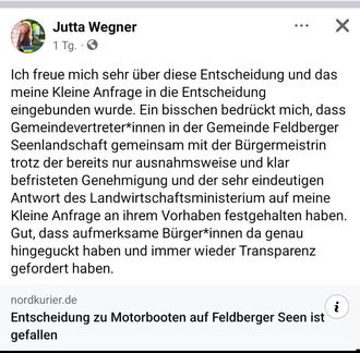 Sie äußern sich in sozialen Medien zur Entscheidung zum Motorbootverkehr in der Gemeinde Feldberger Seenlandschaft.
