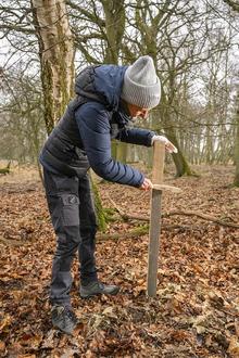 Ein Lockstock wird aufgerauht. Nicht jeder darf einfach selbst Lockstöcke aufstellen und nach Wildkatzen suchen.