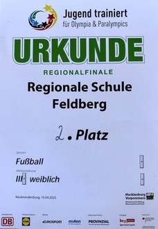 Am 10. April 2025 trat die Fußball-AG der Hans-Fallada-Schule Feldberg mit ihrer Mädchenmannschaft der Wettkampfklasse III (5. und 6. Klasse) beim Regionalfinale in Neubrandenburg an. Dort stellten die Spielerinnen zunächst ihr Können in einem Technikteil unter Beweis, den sie mit viel Geschick und Einsatz meisterten. Im anschließenden Spiel gegen die evangelische Schule aus Neustrelitz mussten sie sich zwar geschlagen geben, sicherten sich jedoch mit dem zweiten Platz die Teilnahme am Landesfinale in Rostock am 25. Juni 2025.