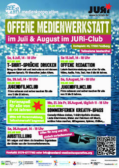 Ihr habt Ferien und wir müssen arbeiten. Für Euch! Im Sommerferienprogramm dreht sich alles um das Selbermedienmachen. Ihr könnt mit uns T-Shirts gestalten, Comedy-Videos drehen, Leute interviewen, auf Fotosafari gehen, Malen, Zeichnen, Musik hören, und vor allem selbst Vorschläge machen, was wir zusammen auf die Beine stellen könnten mit Computern, Kameras, Mikrofonen und Druckerpresse.