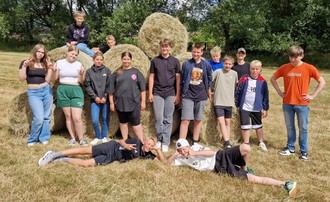 Zum Abschluss des Tages halfen die 7.-Klässler beim Zusammenrollen der Strohballen auf dem Feld. Mit viel Teamgeist stapelten sie die Ballen zu einer großen Pyramide - ein tolles Gemeinschaftserlebnis!