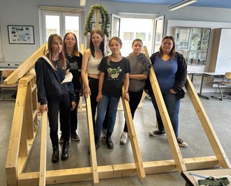 Und dann gab es noch ein echtes Highlight: Die Handwerkskammer baute mit einer Gruppe von Mädchen(!) einen kleinen Dachstuhl im Schulgebäude auf. So fix und perfekt wie die Mädels das hinbekommen haben, war klar: Handwerk ist ganz sicher keine reine „Männersache“. Ein Mini-Richtfest inklusive stolz erhobenem Richtkranz rundete die Aktion ab.