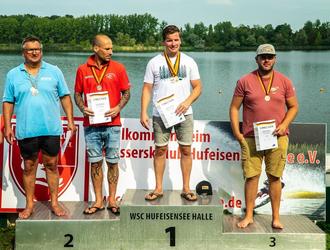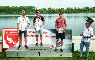 Mit Tim Beier war auch der Slalomspezialist des Vereins mit nach Halle gereist. Nach einer schweren Verletzung im letzten Jahr, einem langen Weg der Regeneration und neuem Aufbautraining in der Saison war es schon etwas Besonderes, ihn in dem Jahr bei einem nationalen Titelevent auf dem Wasser zu sehen. Er ging in der offenen und leistungsstärksten Klasse an den Start. Mit 1,5 Bojen im Vorlauf und 0,5 Bojen im Finale bei der 12m-Leine mit maximaler Bootsgeschwindigkeit von 58 km/h hat er nahezu sein Vorjahrsniveau erreicht und wurde dafür mit einem Platz auf dem Podest und einer Bronzemedaille belohnt.
