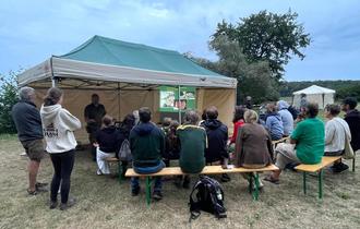Der Naturpark Feldberger Seenlandschaft hatte auf der Badewiese am Hüttenberg zur Fledermausnacht eingeladen. Große und kleine Fledermausinteressierte konnten hier zunächst werkeln und basteln und sich die Ausrüstung der Fledermausschützer und -forscher anschauen. Bei einem Blick durchs Mikroskop auf die Hinterlassenschaften der Fledermäuse wurden u.a. Flügel- und Beinreste entdeckt – die unverdaulichen Überbleibsel der gefressenen Insekten. Diese Chitinreste tragen übrigens dazu bei, dass Fledermauskot, anders als Mäusekot, glänzt und sich leicht zwischen den Fingern zerreiben lässt. Und ganz nebenbei ein ausgezeichneter Blumendünger ist. Mit selbstgemachten Samenkugeln voller Nachtfalterblumen konnten die Besucher auch Anregungen für einen insekten- und damit fledermausfreundlichen Garten mit nach Hause nehmen.